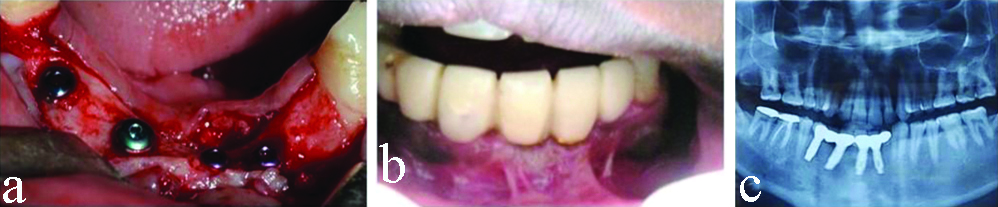 Five months following ridge augmentation, a second surgery was performed for implant placement in grafted site. Site re-entry was done following incision line of first surgery. Fixation screws were removed after assessing block stability. Four implants (Osstem Implant System; two of 11.5×3.5 mm, one each of 11.5×4.0 mm and 11.5×4.5 mm) were placed in planned positions using manufacturer specified drilling protocol [Table/Fig-3]. The planned positions of the four dental implants in the mandible were: left central incisor region, right lateral incisor region, right canine region and right first premolar region. All drills and implant measurement equipment used were of Osstem Implant System. All drillings were performed at insertion torque between 25-35N. Initially, a punch cut was made using pilot drill at 1,500 rpm to determine the fixture position. This was followed by use of 2.0 mm diameter twist drill at a speed to 1,500 rpm which was extended till the desired length of the planned implant (right central and lateral incisor, canine and first premolar regions). Achieved depth was confirmed using a depth gauge. Subsequently, larger diameter drills were used at speeds of 800 rpm to 1,200 rpm till the desired diameter was achieved. All drillings were done under copious irrigation. Orientation of two adjacent implant holes was confirmed using parallel pins before proceeding with implant insertion. Provisional prosthesis was given three months after implant placement to improve patient’s aesthetics [Table/Fig-3]. Postsurgically the patient was asked not to consume hard and hot food, not to use straw for consuming liquid, to avoid forceful spitting by creating negative suction pressure, not to evert the lip to see the surgical site in the mirror, not to poke the surgical area with tongue or any other aid such as toothpick and not to brush in the area. Patient was asked to do ice pack application in the area and switch to warm saline rinses after 24 hours.