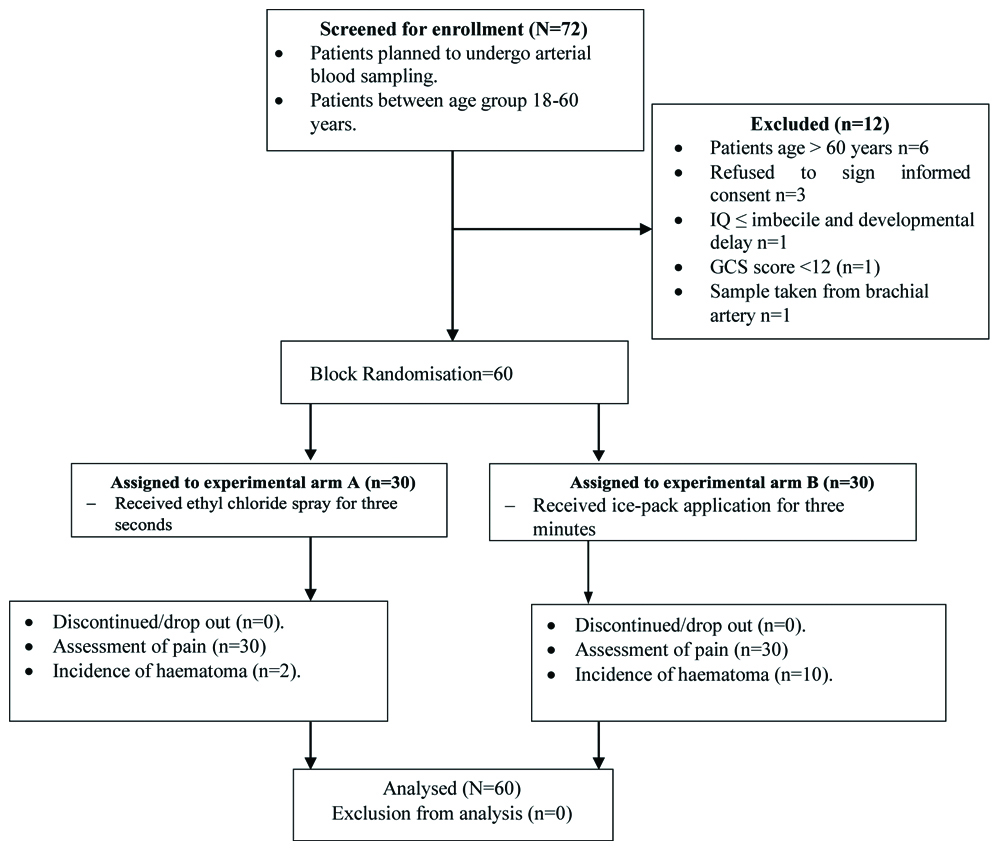 No similar study was found, thus sample size was calculated based on pilot study results using sample size calculation software (G power software by http://www.ats.ucla.edu/stat/gpower/pairedsample.htm) [6]. Pilot study results of 20 participants (10 in each arm) revealed that mean pain scores were 2.78±0.16 and 2.90±0.18 among ethyl chloride (experimental arm A) and ice pack (experimental arm B), respectively. With 5% level of significance and 80% power, 26 participants were required in each arm. In this study, 60 participants were included after considering 20% attrition rate. Participants were enrolled in the study using consecutive sampling technique and then they were assessed for confirmation of eligibility criteria, before they were finally recruited in the trial. Recruitment of participants under this trial was terminated at the time when calculated sample size was achieved for both arms. Participants were randomly assigned to experimental arm A and experimental arm B. Randomisation was done using computer generated random list and allocation concealment was performed by sequentially arranged opaque sealed envelopes.
