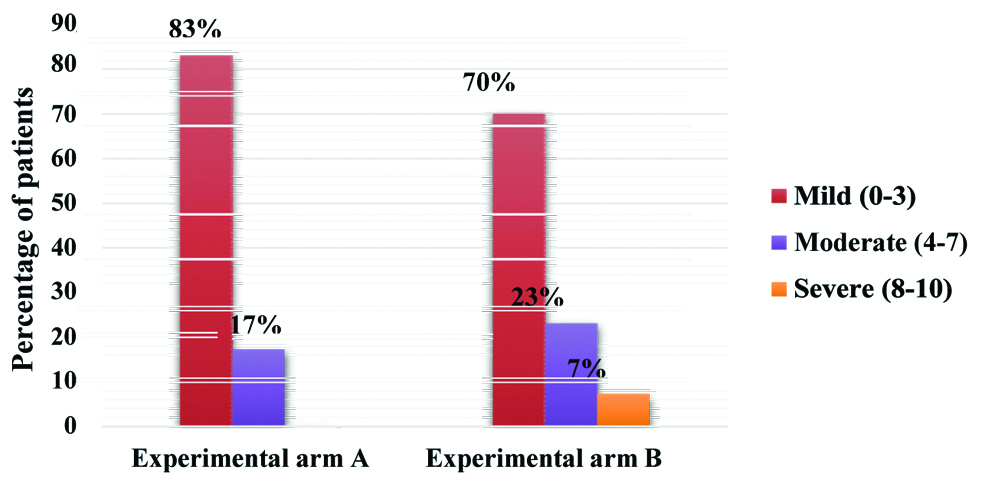 [Table/Fig-3] shows the mean pain score experienced by participants during radial AP were 2.5±1.2 in experimental arm A and 3.1±1.8 in experimental arm B. Differences on pain scores were analysed by Mann-Whitney U test; analysis revealed no significant difference between the groups. Scores of pain during radial AP were categorised into mild, moderate and severe and analysed by frequency and percentage [Table/Fig-4]. Mild pain was reported by 83% and 70% of participants in experimental arm A and experimental arm B, respectively. However, no participants in experimental arm A and 7% participants in experimental arm B reported severe pain during procedure.