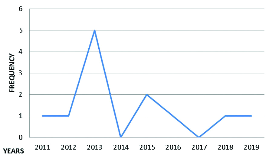 Twelve cases of Brucella melitensis were reported from the Department of Microbiology, Jubilee Mission Medical College, Thrissur, Kerala, India during this eight year period. Eleven of them were PUO cases (from non-repetitive blood samples) and one a soft tissue infection case (breast abscess). A total of 52880 blood samples were processed in Microbiology Department over a span of eight years and among which 5182 (9.8%) blood cultures were from patients suspecting PUO. Blood culture positivity rate of the laboratory was 8.2% (425). The organisms isolated from blood culture are detailed in [Table/Fig-1]. The annual distribution of Brucella cases are summarised in [Table/Fig-2].