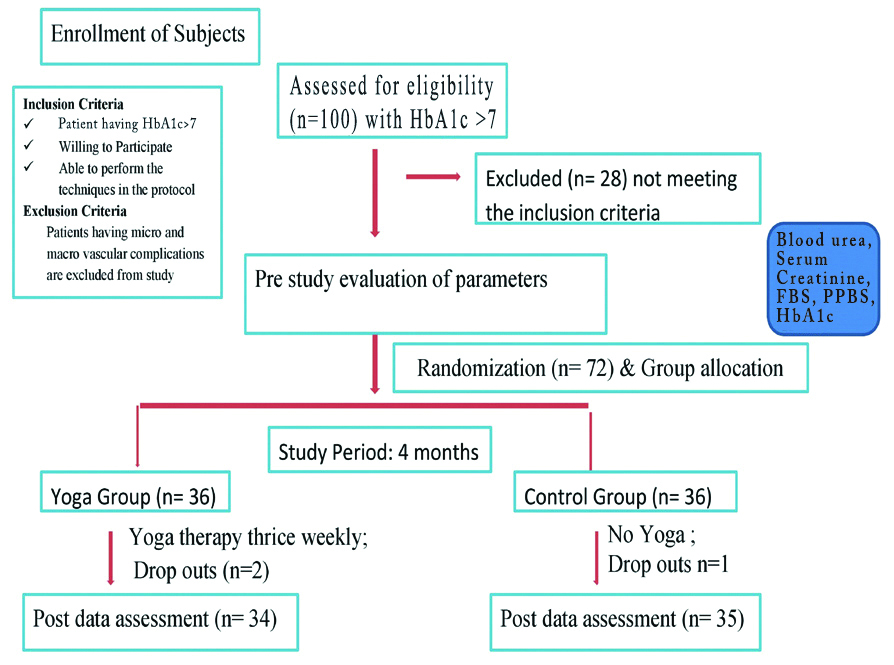 This randomised controlled trial of four months (November 2016 to February 2017), was undertaken as an interdisciplinary collaborative work between the Centre for Yoga Therapy Education and Research (CYTER) of Sri Balaji Vidyapeeth, and the Department of Endocrinology of Mahatma Gandhi Medical College and Research Institute (MGMC&RI), Puducherry. Approval was obtained from Institutional Research Council of MGMC and RI (MGMCRI/ IRC/2017/0177), and Institutional Human Ethics Committee, Sri Balaji Vidyapeeth (PG Dissertation/2017/05/76). The study was also registered with CTRI (CTRI/2017/11/010479).