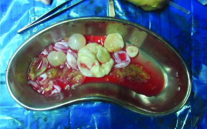 The provisional diagnosis of hydatid disease of spleen was given based on the above imaging findings. Open total splenectomy was performed for the patient with preoperative treatment with albendazole for 10 days. The postoperative period was uneventful. Gross splenectomy specimen [Table/Fig-6] measuring 10×7 cms and cut specimen of spleen showing multiple fluid-filled vesicles is shown in [Table/Fig-7]. It was proved to be hydatid cyst of spleen on histopathological examination.