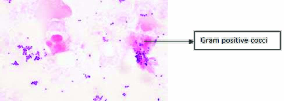 Direct gram stain of ear swabs of patients with CSOM showing gram positive cocci (X1000).