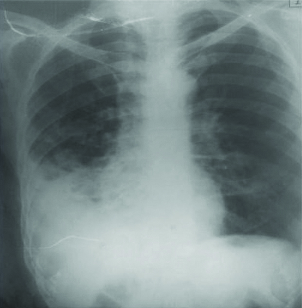 Chest X-ray-PA showing non homogenous opacity in right lower zone with reticular opacities in bilateral lung fields.