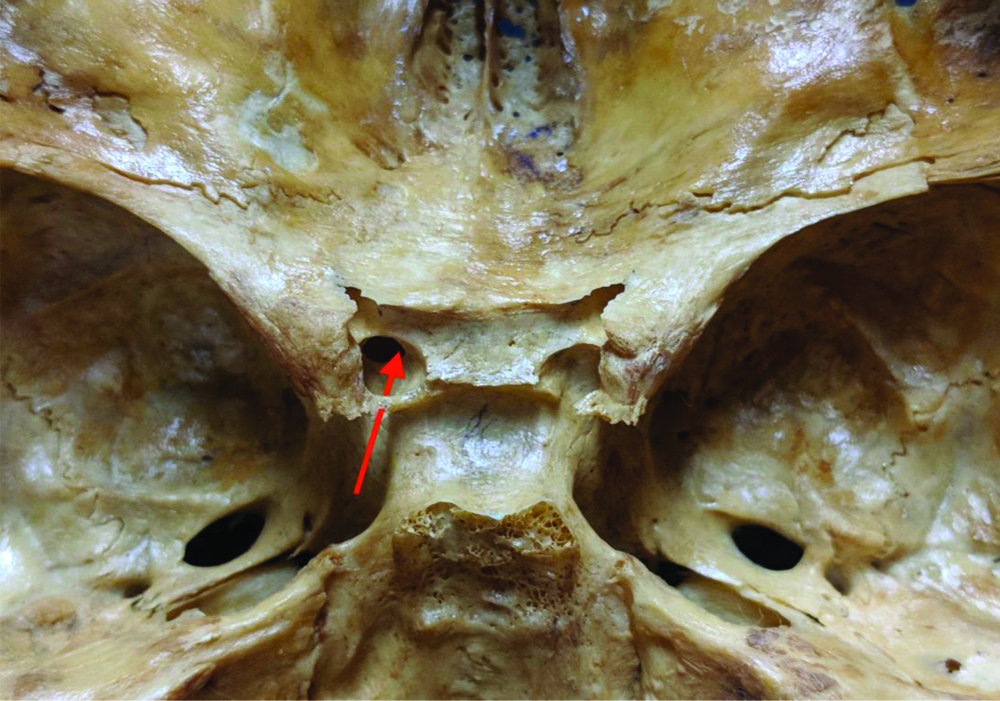 Studies have shown significantly different data regarding its prevalence. For instance, a study conducted by Brahmbhatt RJ et al., [8] showed a prevalence of 6%, while a study conducted by Efthymiou E et al., [5] showed a prevalence of 73%, which highlights regional differences [6]. There is a lack of studies regarding its prevalence in South American skulls [9]. Thus, the present study aims to observe the prevalence and size of the CCF in Brazilian dry skulls and discuss its surgical and clinical significance.
