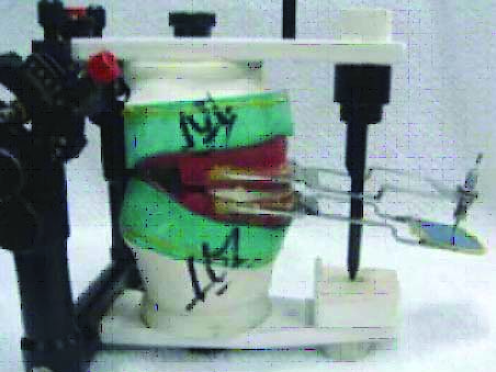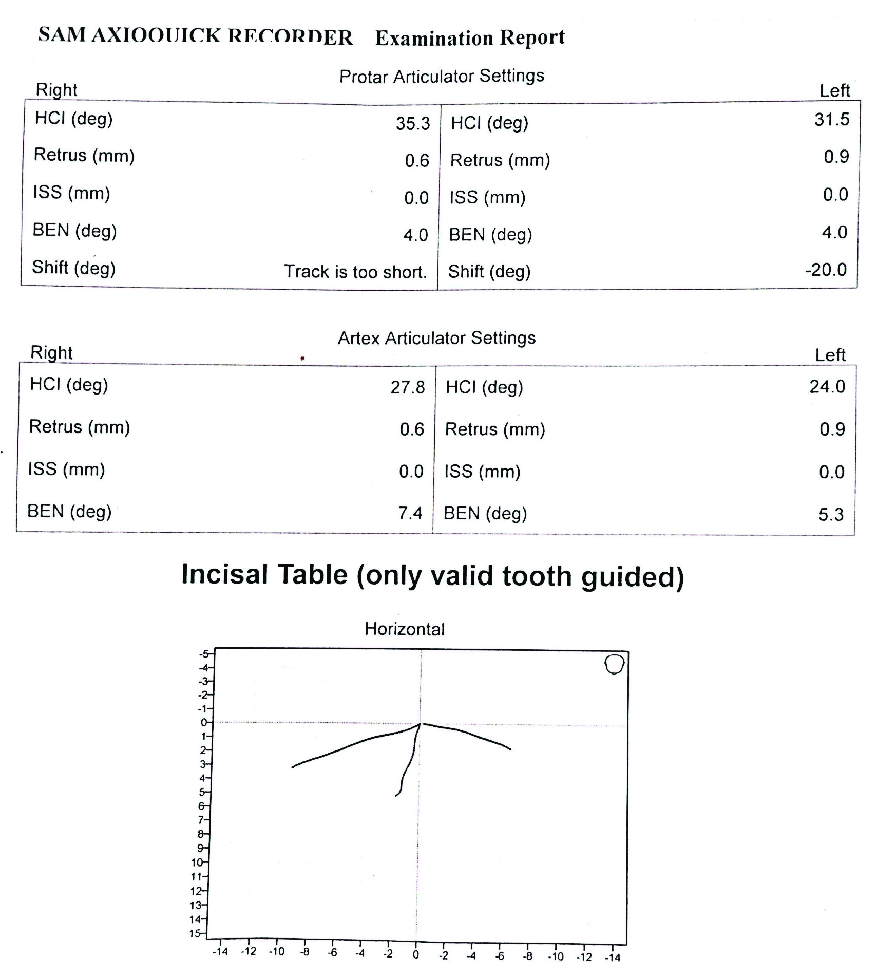 The patients were asked to visit the Temporomandibular joints (TMJ) Clinic where the computerised recording of mandibular movement was made by using axiographic jaw tracking device, the axio-quick recorder, ultrasonic Axiograph, was used to record mandibular movement. The combination of Axioquick® with a contactless ultrasonic recording device allows the 3D acquisition of all mandibular movements [Table/Fig-6]. The patients were seated in an upright position following which the jaw tracking device was attached to the waxed up complete denture, the device was attached to the monitor that works on software version 1.0, SAM 3 to record the jaw movement. The recording of the jaw movements was received while patients was asked to open the jaw in rotational movement and translational movement of the jaw, later the patient was asked to make left lateral and right lateral movement and protrusive movement. The values obtained from the axiograph were utilised to program the semi-adjustable articulator [Table/Fig-6,7]. These values obtained from axiographic tracing were compared with the values obtained from Gothic arch tracers, and the orthopantomographic values. Following which the obtained data was statistical analysed.