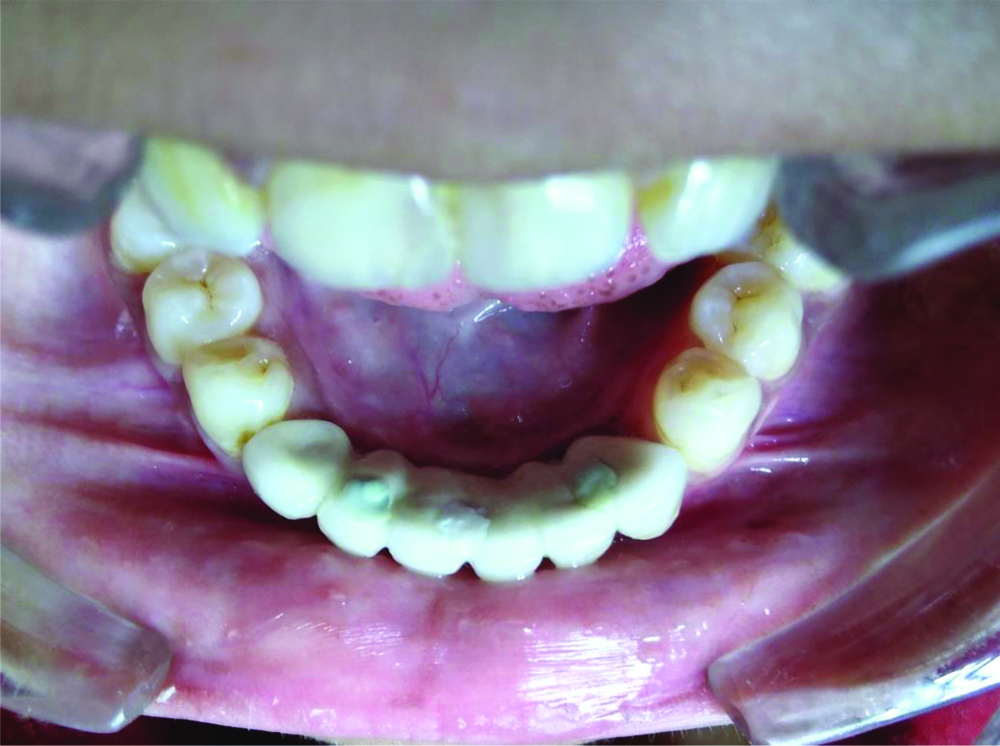 Interim prosthesis: Patient and her parents insisted on definitive prosthetic treatment like implants. However, considering the young age of the patient an interim fixed prosthesis in the form of an aesthetic functional fixed space maintainer was planned, fabricated and delivered in lower anterior region in between the recall visits [Table/Fig-6].