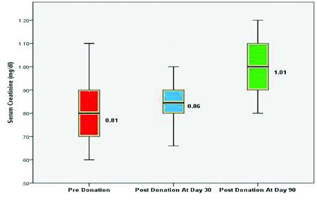 Out of 50 kidney donors, 43 individuals donated the left kidney and 07 individuals donated the right kidney. The mean serum creatinine was 0.81±0.11 mg/dL before kidney donation. The mean serum creatinine increased to 0.86±0.10 mg/dL and 1.01±0.12 mg/dL at 30 and 90 days postdonation respectively which was statistically significant (p-value <0.0001) as compared to serum creatinine predonation as depicted in [Table/Fig-3].