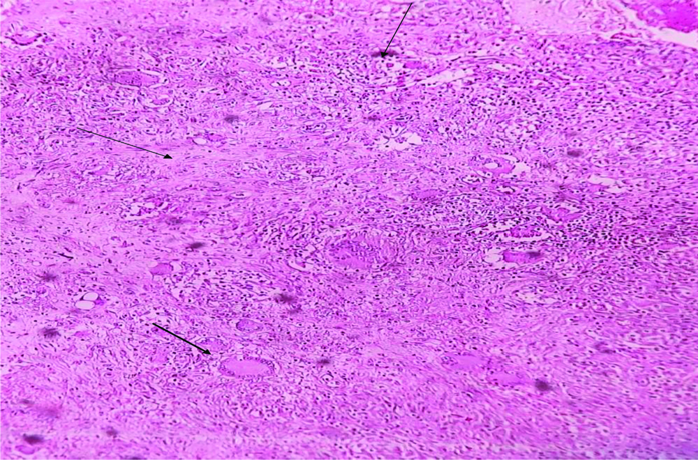Histopathological Examination (HPE) of spine tissue showing granulomas with areas of caseation necrosis, epithelioid cells, Langahan’s, and foreign body giant cells H&E,10X.