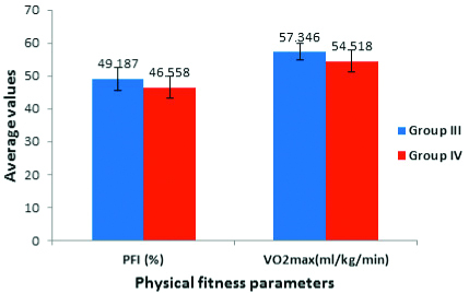 [Table/Fig-3,4] depict high values of PFI and VO2max among Group I (normal weight boys) compared to Group II (overweight/obese boys) and Group III (normal weight girls) compared to Group IV (overweight/obese girls).