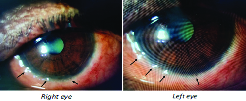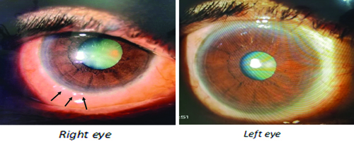 During her next visit one week later, the patient complained of itching and redness in both eyes. The IOP in the right and left eyes was 19 and 18 mmHg, respectively. The right eye slit-lamp examination revealed a few small follicular lesions on the limbus and redness, while the left eye showed only mild redness [Table/Fig-2]. The patient was started on Loteprednol (a corticosteroid) and Carboxymethylcellulose (a lubricant) eye drops, with a provisional diagnosis of allergic conjunctivitis, and was scheduled for follow-up after one week.
