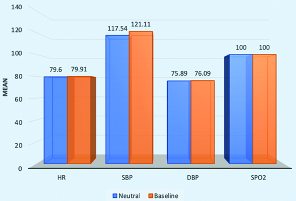 Comparison of Heart Rate (HR), Systolic Blood Pressure (SBP), Diastolic Blood Pressure (DBP), Serum Pressure of Oxygen (SpO2) in baseline to neutral position.