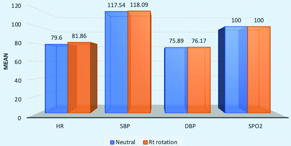 All the patients were comparable in terms of their demographic profiles, as shown in [Table/Fig-3]. Hemodynamically, no significant differences were noted in the various head and neck positions [Table/Fig-4,5,6,7 and 8]. There was no significant difference in the change in SpO2 from the preoperative period to any of the follow-up time points.