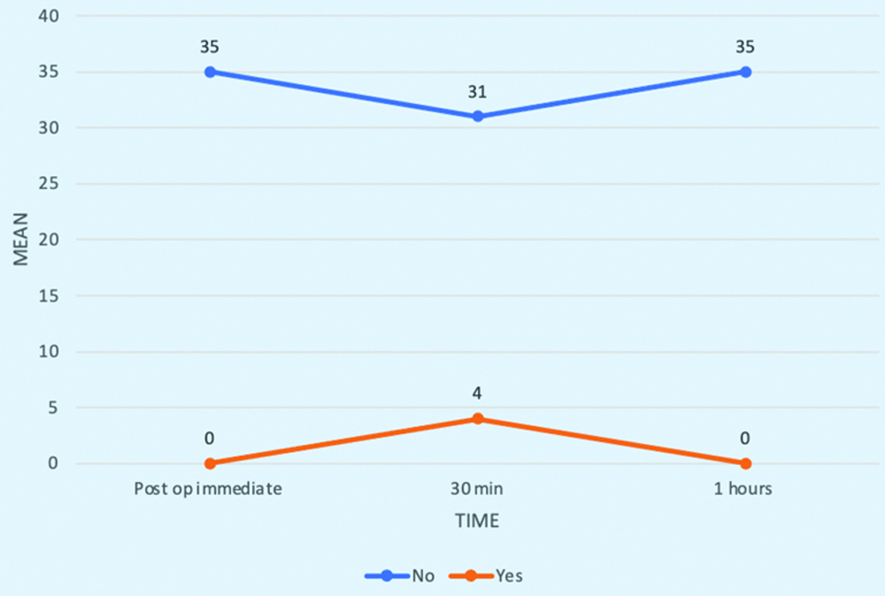 None of the patients had immediate postoperative sore throat; however, four patients out of 35 reported a sore throat after 30 minutes in the postoperative period, resulting in a p-value of 0.01, which is highly significant concerning the LMA Protector device. These patients also experienced self-resolving symptoms without any intervention [Table/Fig-12].