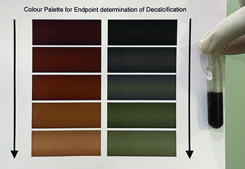 In the present study, the utility of the von Kossa stain/silver nitrate crystals has been employed for endpoint determination of decalcification. The calcium in the decalcifying agent reacts with the silver nitrate solution, producing a colour change. A transition from a darker shade to a lighter shade indicates a decrease in calcium concentration in the solution. A lighter shade denotes the completion of decalcification.
