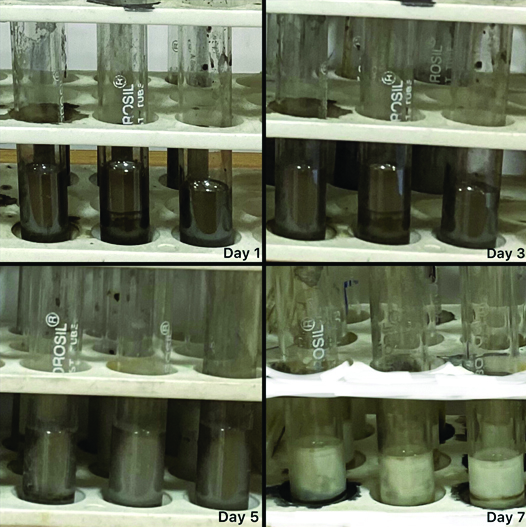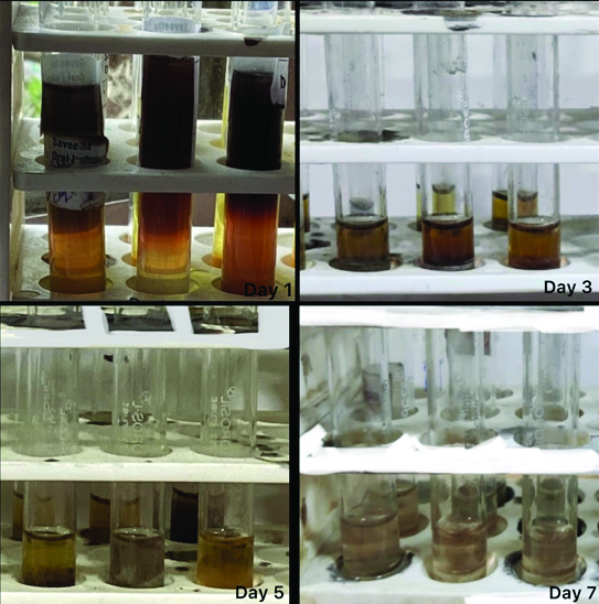 This figure represents the colour change that was noted 10 minutes after the addition of silver nitrate on day 1, day 3, day 5, and day 7. The colour change ranged from darker brown to light brown. Light brown denotes the end point of decalcification.