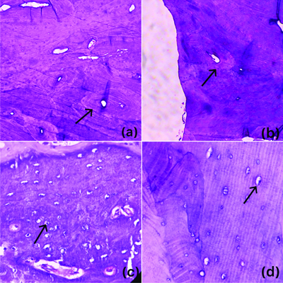 a&b) Photomicrograph shows H&E-stained Sections of bone with osteons with concentric lamellae and interstitial lamellae (H&E, 100X); c&d) Osteocytes within the osteocyte lacunae (H&E, 400X).