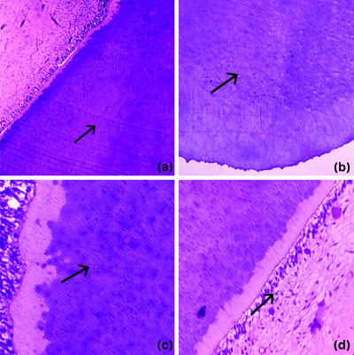 a-c) Sections of tooth with dental tubules (H&E 100X); (d) Dentin-pulp interface with odontoblasts and pulp tissue (H&E,400X).