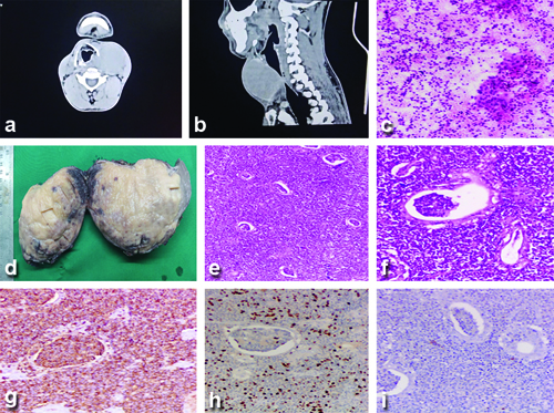 A 43-year-old male with no history of any co-morbidities came to the OPD with complaints of an anterior neck swelling of eight years’ duration. On examination, a firm nodule of size around 3×3 cm was noted in the left lobe of the thyroid gland. USG of the neck showed a well-defined heterogeneous nodule at the isthmus reaching upto the left lobe of the thyroid with prominent vascularity on colour Doppler. CECT showed an intensely homogeneous enhancing mass with an irregular outline involving the left lobe and isthmus. The lesion is noted to extend to the left anterolateral aspect of the trachea and anteriorly infiltrating the strap muscles, with radiological features suggestive of malignancy. The patient was referred to the Surgical Oncology Department. Imaging-guided FNAC smears showed cellular smears suggestive of a follicular neoplasm. The patient underwent total thyroidectomy with central compartment node dissection and partial tracheal resection (first and second ring). Intraoperatively, the airway was secured initially with endotracheal intubation, and after post-tracheal resection, the patient was tracheostomised. Histopathological examination {Haematoxylin and Eosin (H&E)} showed a tumour composed of sheets and nests of polygonal cells with eosinophilic cytoplasm and deep-staining nuclei, with foci showing a Zellballen appearance. A differential diagnosis of parathyroid carcinoma/paraganglioma was suggested with invasion of the tracheal rings and strap muscles. All the level VI nodes were negative for metastasis. In immunohistochemistry, tumour cells were positive for synaptophysin, chromogranin, vimentin, GATA 3, and S100, and negative for Cytokeratin (CK), Thyroid Transcription Factor 1 (TTF1), Calcitonin, CAM 5.2, thyroglobulin, and PAX 8. The Ki proliferation index was 4-5%. A diagnosis of paraganglioma of the thyroid gland was made [Table/Fig-2a-c]. Postoperative whole-body Fluorodeoxyglucose-18 (FDG) Positron Emission Tomography (PET) showed no evidence of metabolically active FDG-avid disease anywhere else, suggestive of no distant metastasis. The patient is on regular follow-up with 75 mcg of oral thyroxine/day supplementation.