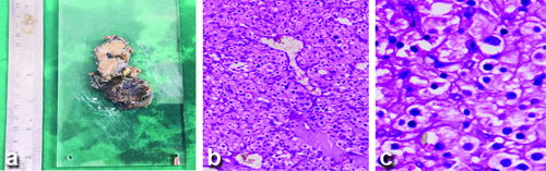 a) Gross cut surface specimen of the thyroid paraganglioma; b) Histopathology section showing round, polygonal cells arranged in nests (Zellballen pattern, H&E, 100X); c) Cells showing round to ovoid nuclei with eosinophilic cytoplasm (H&E, 400X).