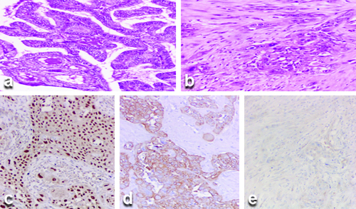 a) Histopathology section showing classical papillary thyroid carcinoma areas (H&E stain, 100x magnification); b) Histopathology section showing squamoid cell areas (H&E stain, 100x magnification); c) Tumour cells showing positive staining with p63 antibody (100x magnification); d) Tumour cells showing positive staining with CK-5 antibody (100x magnification); e) Squamoid areas showing negative staining with TTF-1 antibody (100x magnification).