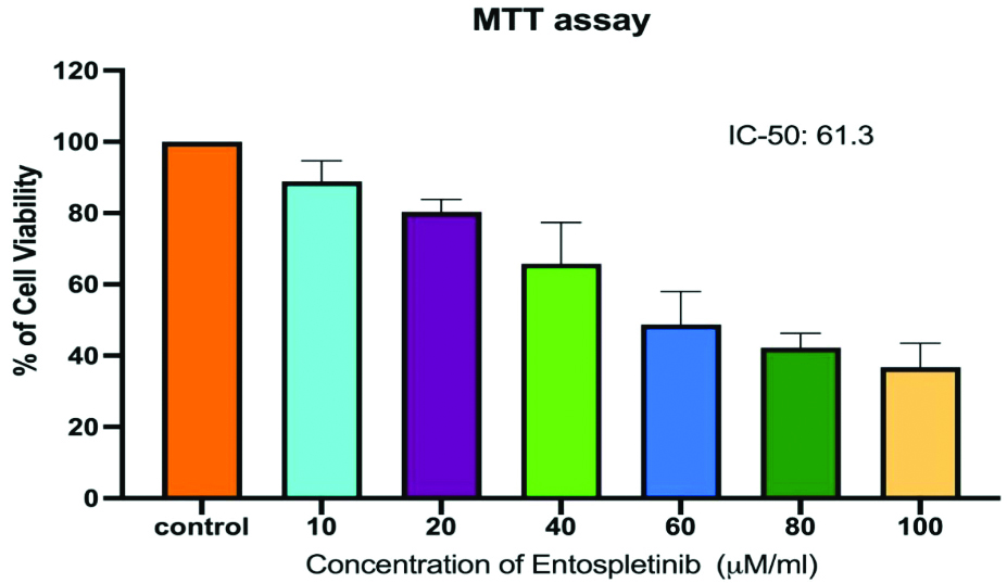 The MTT assay results revealed a significant reduction in cell proliferation, with percentages of 88.84, 80.32%, 65.78%, 48.70%, 42.28 and 36.80% (p <0.05) in 24 h time points at concentrations of 10, 20, 40, 60, 80 and 100 μM/mL of Entospletinib, respectively in Y-79 cells [Table/Fig-1]. Entospletinib significantly reduced the viability of RB cells compared to the untreated group at both 24-hour time points. The percentage of cell viability gradually decreased with an increase in the concentration of Entospletinib, reaching 50% growth inhibition at a dose of cell viability progressively declined with increasing concentrations of Entospletinib, resulting in 50% growth inhibition at a concentration of 61.3 μM/mL [Table/Fig-1]. Therefore, the aforementioned dose was chosen for subsequent experiments inverted microscopy analysis showed that the treated cells exhibited notable morphological alterations compared to the control cells, including cell shrinkage and reduced cell density, indicative of apoptosis [Table/Fig-2].