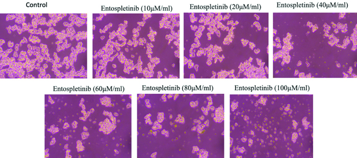 Morphology study: From the MTT assay, the optimal doses of Entospletinib (IC50: 61.3 μM/mL for RB cell line) for further studies were determined. Morphological changes were assessed using phase-contrast microscopy. For this, 2×105 cells were seeded in 6-well plates and treated with Entospletinib for 24 hours. Following incubation, the medium was discarded, and the cells were rinsed with phosphate-buffered saline (PBS, pH 7.4) before being examined under a phase-contrast microscope.