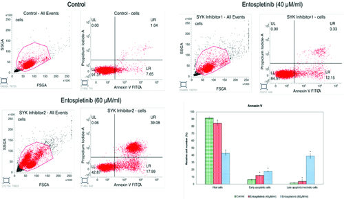The effect of Entospletinib on apoptosis in Y-79 cancer cells was assessed using annexin V-5-Fluorescein Isothiocyanate (FITC)/Propidium Iodide (PI) staining, followed by flow cytometry. Representative plots illustrate annexin V-FITC/PI staining of Y-79 cells treated with Entospletinib at concentrations of 40 and 60 μM/mL. The graph presents the results from three independent experiments, with data expressed as mean±SD.