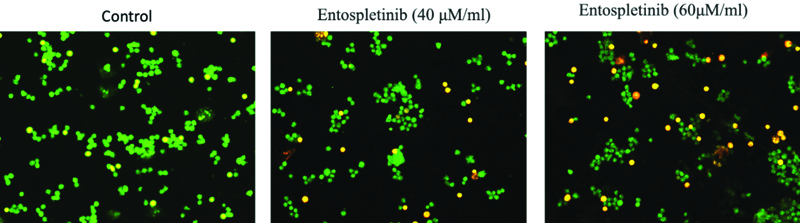 To ascertain whether cultured RB cells undergo apoptosis, we analysed untreated and Entospletinib-treated Y-79 cells using Annexin-V and PI and AO/EtBr dual staining. Entospletinib-treated Y-79 cells exhibited a higher percentage of apoptosis cells when compared to the untreated group. Overall, the percentage of apoptotic cells increased in Entospletinib-treated Y-79 cells (15.48% in 40 and 57.97% in 60 μM/mL, n=3, P≤0.05, [Table/Fig-3] compared to untreated cells, without showing necrotic signs in both Entospletinib treated and control cells. To further understand cell death mechanisms, specifically apoptosis or necrosis, the authors utilised the AO/EtBr dual staining procedure to examine the nuclei morphology in both control and Entospletinib treated cells [Table/Fig-4]. The AO/EtBr dual staining results aligned with our quantitative apoptosis analysis, confirming that the highest rate of apoptosis, characterised by nuclear deformation and loss of cell wall integrity, was observed in RB cells treated with Entospletinib.
