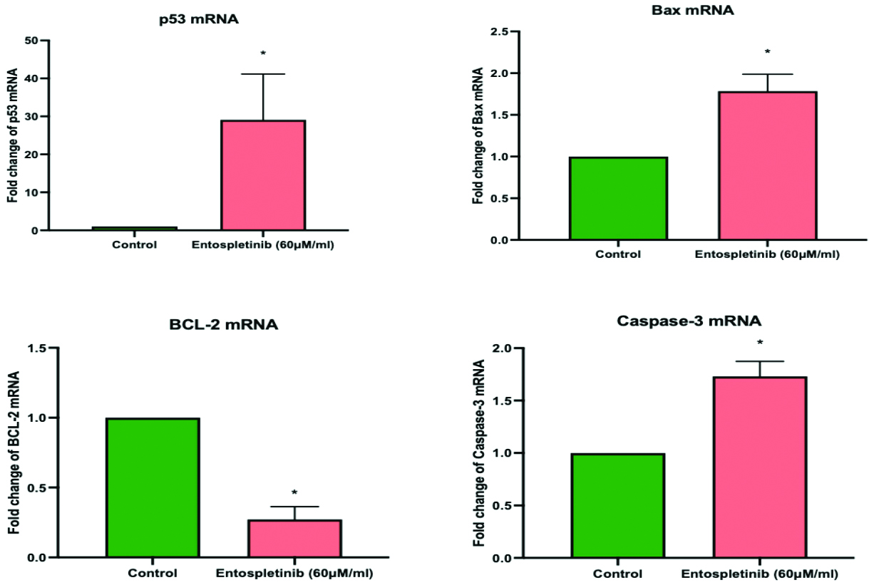 To assess the impact of Entospletinib on the intracellular signaling molecules governing its proapoptotic activity in Y-79 cells: As a subsequent analysis, we interrogated the mRNA expression profile of The Bcl-2 protein family, caspase 3 and p53 through real-time PCR. The Bcl-2 protein family includes both pro-apoptotic proteins like Bax and anti-apoptotic proteins like Bcl-2. Activation of this family leads to the release of pro-apoptotic factors, such as cytochrome c, into the cytosol, subsequently initiating caspase activation. p53, on the other hand, is a tumour suppressor gene, and studies suggest that p53 pathway is inactivated in RB Entospletinib demonstrated a substantial rise in the expression of pro-apoptotic proteins, namely Bax, and Caspase-3 and tumour suppressor gene in RB cell lines [Table/Fig-5]. Furthermore, in the Y-79 cell line, it downregulated the expression of the anti-apoptotic protein Bcl-2.