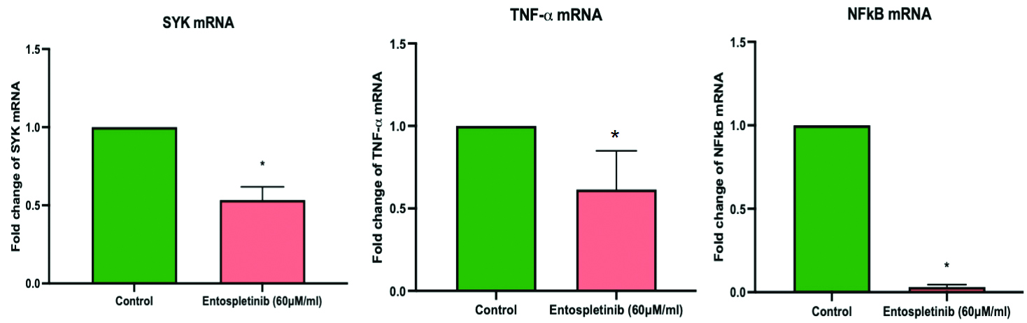 Further, the authors also explored how Entospletinib influences the mRNA expression levels of key components within the SYK signaling pathway in RB cells. Treatment with Entospletinib (60 μM/mL) resulted in a significant decrease in SYK mRNA expression, a critical component of the signaling pathway implicated in RB cell survival and proliferation compared to untreated control cells. Entospletinib treatment also led to a pronounced reduction in TNF-α mRNA levels in RB cells (p-value<0.05) [Table/Fig-6]. TNF-α is known to activate the NF-κB pathway, promoting cell survival and inflammation. Consistent with the inhibition of TNF-α expression, Entospletinib treatment also resulted in the downregulation of NFκB mRNA [Table/Fig-6] and its protein levels (p-value<0.05) [Table/Fig-7] in RB cells.
