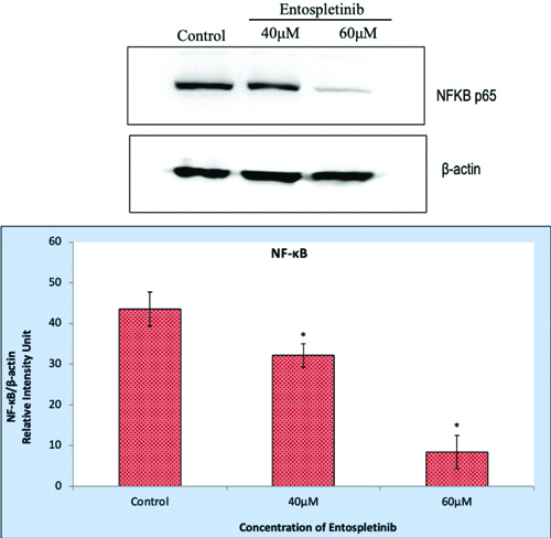 The protein expression of NF-κB p65 in Entospletinib treated Retinoblastoma (RB) cells (Y-79) by western blotting analysis. The protein expression of NF-κB p65 in Entospletinib (40 and 60 μM/mL for 24h) treated Y-79 Retinoblastoma (RB) cellsβ-actin served as the internal control. The data are presented as the mean±SEM from three independent experiments. Asterisks (*) indicate statistical significance between the control and Entospletinib treatment groups, with significance determined at a p <0.05 level using a t-test.