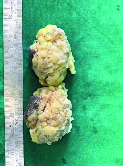 The cut surface of the gross specimen. A well-circumscribed grey, whitish to brownish lump with a granular, firm-cut surface was visible in the part that had been sliced. Patchy regions of grey-white breast tissue were visible nearby. The remaining resection margins are spaced 1.5, 3, 5, and 3 centimeters from the base.