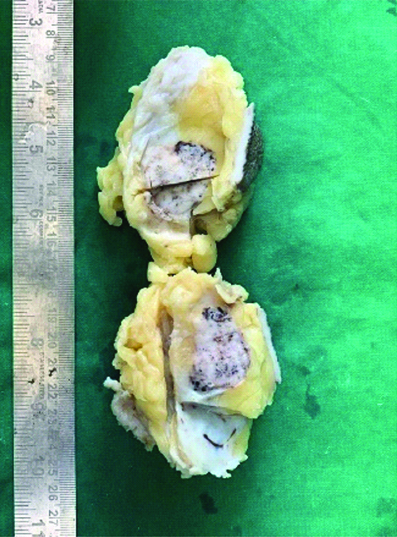 The gross specimen showed a local excision of breast tissue measuring 8×7×4 cm, with a skin flap measuring 6×3 cm [Table/Fig-1]. The cut section revealed a well-circumscribed grey-white to brownish lump with a granular solid cut surface. The adjacent breast tissue displayed patchy grey-white areas. The base margin was 1.5 cm away, while the rest of the resection margins were 1.5, 3, 5, and 3 cm away [Table/Fig-2]. Microscopically, the tumour was well-circumscribed, consisting of a central sclerotic area and solid nodules comprised of sheets of cells separated by fibrovascular septae [Table/Fig-3]. The cells had enlarged, pleomorphic, hyperchromatic, mitotically active nuclei with clumped chromatin and moderate eosinophilic cytoplasm. The adjacent breast tissue showed Lobular Carcinoma in-situ (LCIS) and focal invasion, with no lymphovascular emboli or perineural invasion [Table/Fig-4].