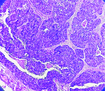 Low magnification microscopic picture of Solid Papillary Carcinoma (SPC) breast- A well-circumscribed tumour with solid nodules and a core sclerotic region is observed under a microscope. The cells exhibit larger, pleomorphic hyperchromatic nuclei with clumped chromatin and mild eosinophilic cytoplasm (4x).