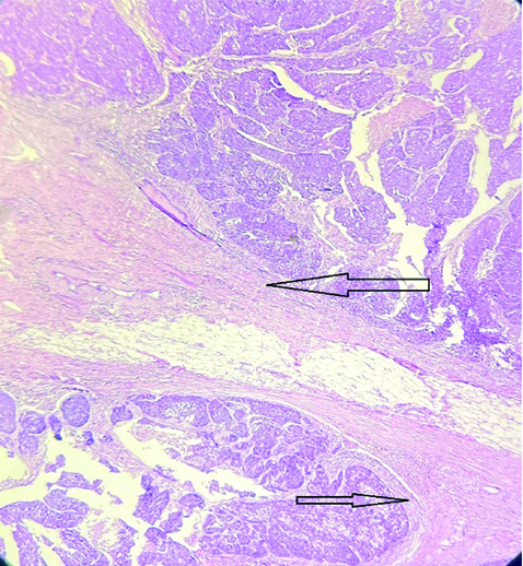 Low Magnification (4x) of Solid Papillary Carcinoma (SPC) - A well-circumscribed tumour in breast tissue was seen under a microscope. It had solid nodules without lympho-vascular emboli or perineural invasion, and a central sclerotic region. Arrows are marked at areas of invasion. (Images from left to right)