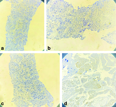 a) IHC Oestrogen Receptor (ER) showing negative for breast lesion (4x); b) IHC Progesterone Recepter (PR) showing negative for breast lesion (4x); c) IHC HER2/neu showing negative for breast lesion (4x); d) p63 negativity suggests that this lesion may be an invasive carcinoma, as myoepithelial cells typically express p63 (4x).