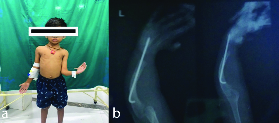a) Classic deformity in the left upper forearm and hand. b) X-ray for the corrected deformity.