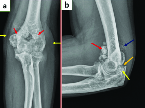 a) X-ray of left elbow joint in extension AP view showing multiple well-defined round calcified extra-articular loose bodies around the elbow joint (red arrows). Mild soft-tissue swelling around the joint is also noted (yellow arrows); b) X-ray of left elbow joint in flexion lateral view showing multiple extra-articular calcified (red arrow), extra-articular non calcified (blue arrow) loose bodies of varying sizes seen at the anterior and posterior aspects of the elbow joint. Intra-articular loose bodies (orange arrow) also seen resulting in widening of ulno-humeral joint space (yellow arrow).