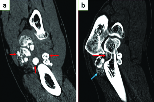 NCCT scan of the left elbow joint: a) Coronal section showing multiple loose bodies around the elbow joint of varying sizes (red arrows) with minimal effusion; b) Sagittal section showing loose bodies with varying degrees of calcifications. Concentric ring-like calcifications are seen (blue arrow). Intra-articular loose bodies (red arrow) in the olecranon fossa.