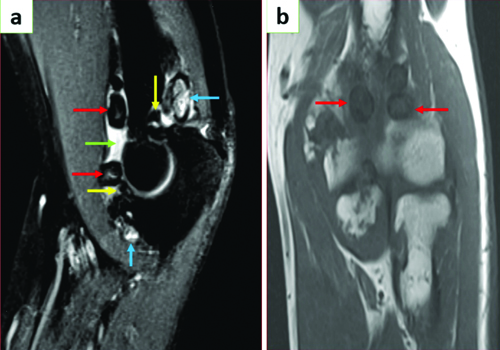 MRI of the elbow joint: a) Sagittal T2 and; b) Coronal T1 sections of elbow joint showing multiple ossified extra-articular (red arrows) and intra-articular (yellow arrows) loose bodies with central hyperintensity in T2WI. Few non-ossified T2 hyperintense loose bodies noted (blue arrows). Joint effusion is seen (green arrow).