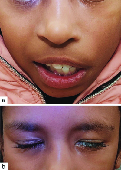 Tests of facial nerve were suggestive of left facial palsy: (a) Deviation of angle of mouth towards right-side with absence of the nasolabial fold on left-side of face while smiling; (b) Incomplete closure of left eye.
