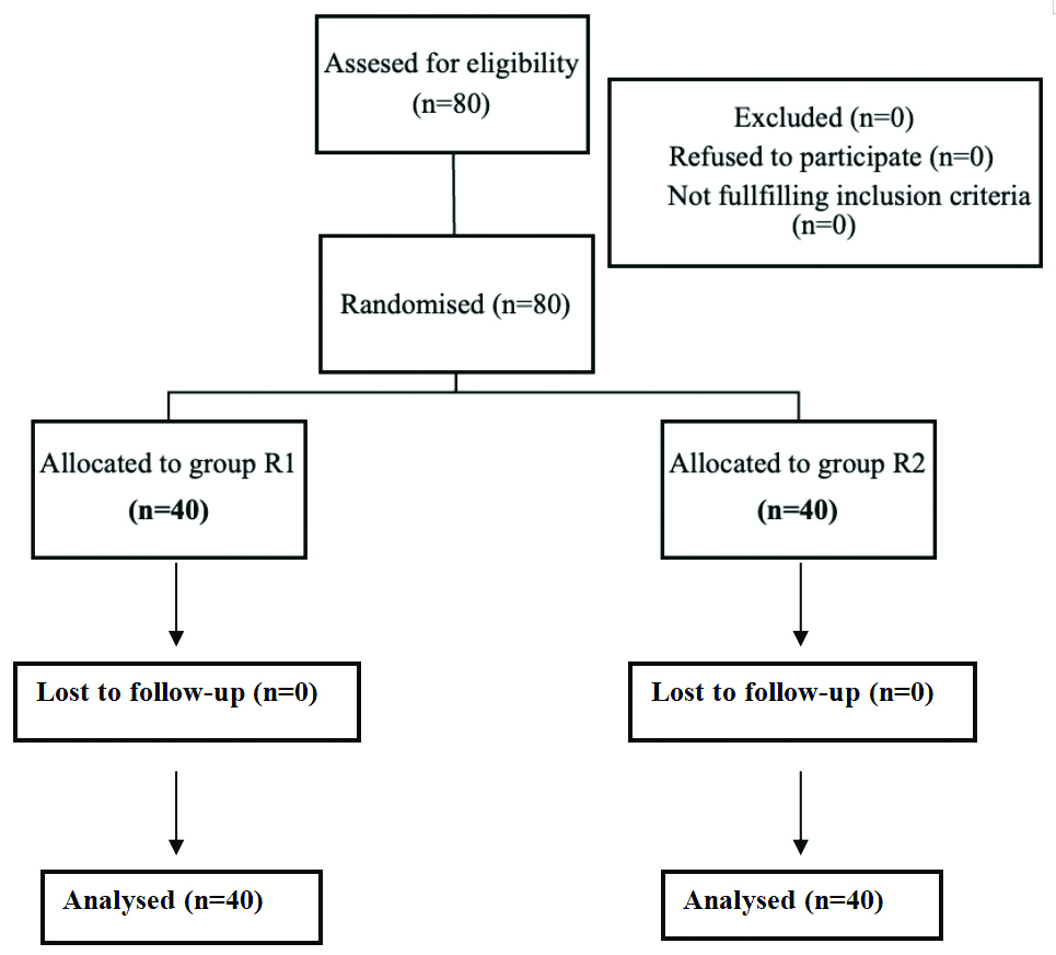 In this parallel group design study, patients who met the inclusion criteria were divided into two groups of 40 patients each, based on a randomised computer-generated sequence. Both the assessor and the patients were blinded to the group allocation, using opaque sealed envelope methods.