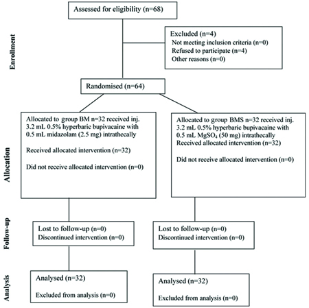 Sixty-four patients (both genders aged 18-65 years and of ASA grade I or II were divided into two equal groups: the BMS (magnesium sulphate group) and the BM (Midazolam group) for elective tibia-fibula surgeries under spinal anaesthesia [Table/Fig-1]. The drug was administered by a consultant anaesthesiologist who was not involved in the study.
