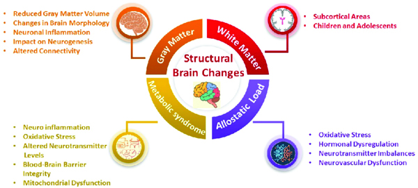 Adipose tissue, particularly visceral fat, produces proinflammatory cytokines {like Tumour Necrosis Factor (TNF)-alpha and Interleukin (IL)-6} that can cross the Blood-brain Barrier (BBB) and promote neuroinflammation [29]. Microglial activation in response to these cytokines damages neuronal cells and contributes to structural brain changes. The brain depends on insulin for energy regulation and glucose metabolism. Obesity-induced insulin resistance in the brain impairs cognitive functions, reduces synaptic plasticity and is linked to neurodegenerative conditions. Leptin and ghrelin, hormones that regulate hunger and satiety, are often dysregulated in obesity [30]. Leptin resistance can disrupt signalling pathways in the hypothalamus and other brain regions, influencing food intake and energy expenditure. Higher levels of free fatty acids and glucose in obesity lead to oxidative stress, which damages neurons and exacerbates neuroinflammation. Obesity negatively affects neurogenesis (growth of new neurons), particularly in the hippocampus. This impairment is closely associated with memory deficits and reduced cognitive flexibility. Synaptic plasticity is also affected, reducing the brain’s ability to form new connections in response to learning and experience. This may be due to changes in neurotransmitter systems, inflammatory markers and insulin signalling pathways [31].