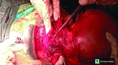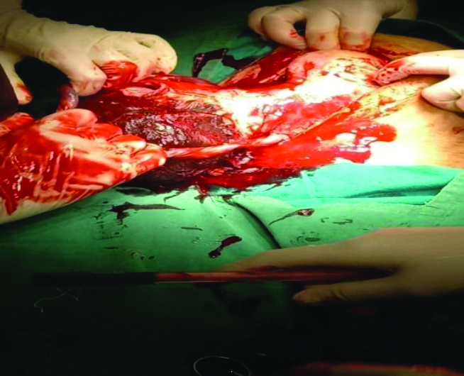Operative findings and procedure: The patient was urgently taken to the Operating Theatre (OT) for an exploratory laparotomy. A midline vertical incision was made, and upon opening the abdomen in layers, a gush of blood was noted upon opening the visceral peritoneum. The foetus was found in the peritoneal cavity and delivered in a vertex presentation.
