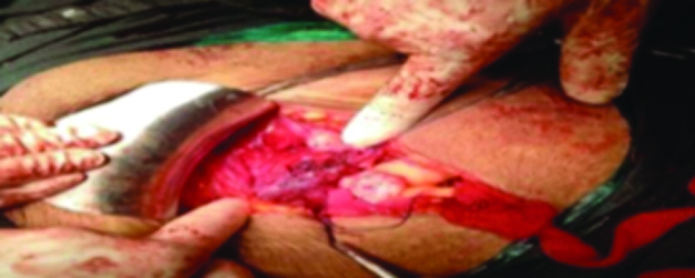 The lower uterine segment and anterior wall of the vagina showed a corrugated margin, indicating rupture [Table/Fig-1,2 and 3]. Given the extensive nature of the rupture, an obstetric hysterectomy was performed. The vaginal vault was closed in a continuously interrupted manner. The specimen was sent for histopathological examination.