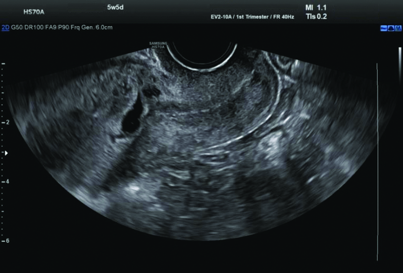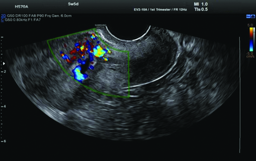 Ultrasound (USG) examination: The USG revealed a single gestational sac in the lower uterine segment at the region of the previous caesarean scar, extending into the anterior myometrial wall with surrounding increased vascularity and decidual reaction, suggestive of scar ectopic pregnancy. The foetal pole and yolk sac were not visualised. The mean gestational sac measured 9.9 mm, corresponding to 5.5 weeks [Table/Fig-4,5].