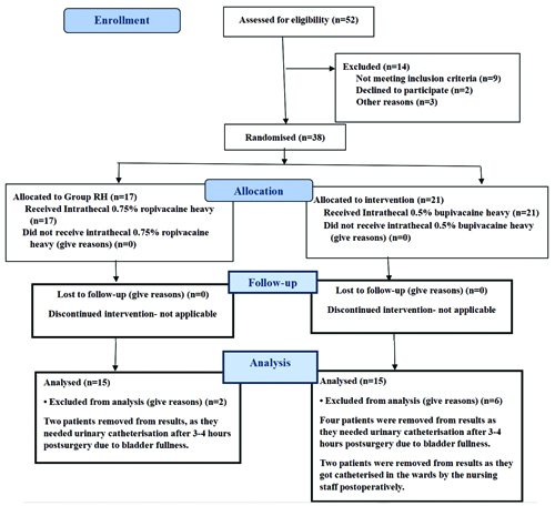 Informed consent was obtained from the patients posted for elective inguinal and/or perineal surgery, and they were then randomly divided using computer-generated numbers into two groups, with 15 patients in each group. The guidelines stated by Consolidated Standards of Reporting Trials (CONSORT) for randomised trials were followed for the present study [Table/Fig-1].