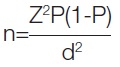Where n is the sample size, Z is the statistic corresponding to the level of confidence, P is the expected prevalence (with p approximately equal to 50%), and d is the precision.